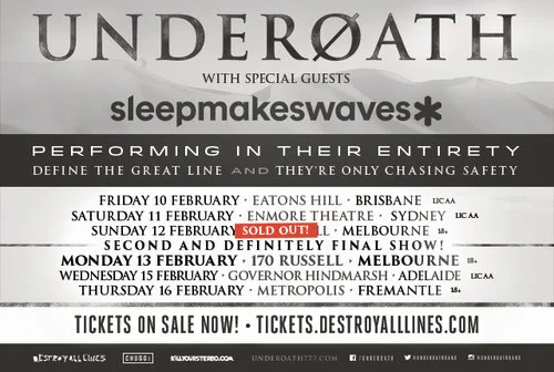 At this point I had started to notice a bit of a pattern with the crowd each night: probably as a result of the type of show that Underoath are known for putting on and the type of music they play, they attract a particular type of crowd; one that wants to jump around and get rowdy and let out their frustrations through the music and get drunk and just let loose. So with a band like SMW who play a much more introspective, ethereal, airy, obviously instrumental and less aggressive style of music, the crowd response has been something like this: a lot of interest and good reception for maybe the first three songs (The Stars Are Stigmata, In Limbs and Bones, Emergent), then a bit of a wane with the next couple (Great Northern, Traced In Constellations), a bit more of a reaction to Keep Your Splendid Silent Sun, and back up to a solid response from the closer Something Like Avalanches (which is the set banger anyway, it will always get a good reaction regardless). Sleepmakeswaves tend to do a lot more headline shows than support shows so I can only imagine that for a band that is used to being able to control a crowd’s emotions so thoroughly just through the music itself (ignoring things like stage presence and banter and whatever else they do up there) it is quite a challenge to bust out what feels like a huge performance and have very little coming back from the audience. However the reviews that have been written of each nights performances have been absolutely glowing, giving SMW massive props amongst the tirades of love going towards Underoath, so there is definitely something for them to take away from what they are doing each night. Sick tour, having a blast.